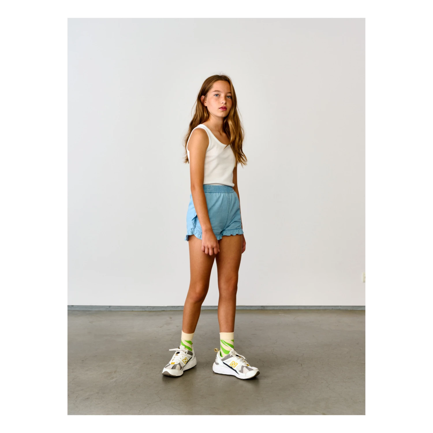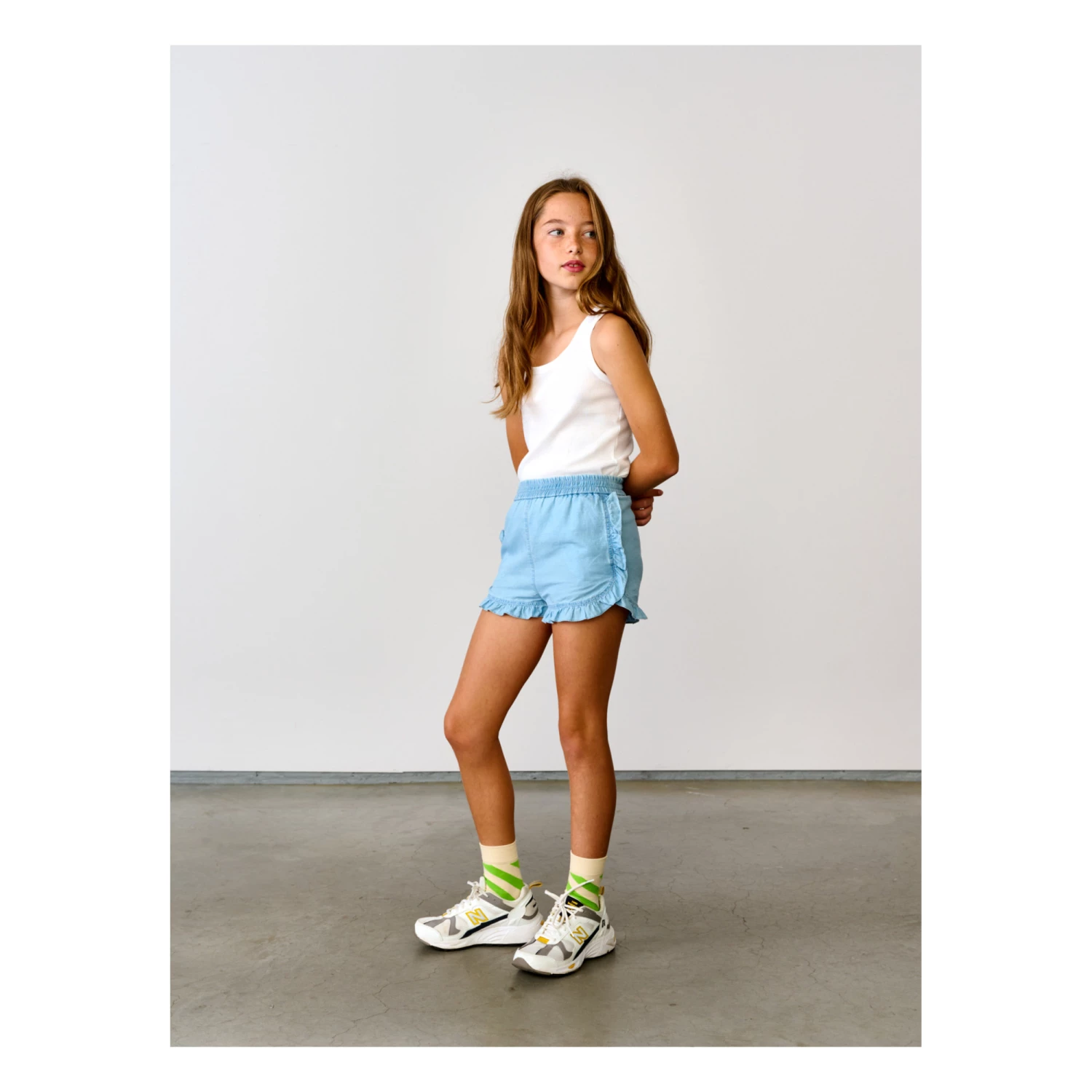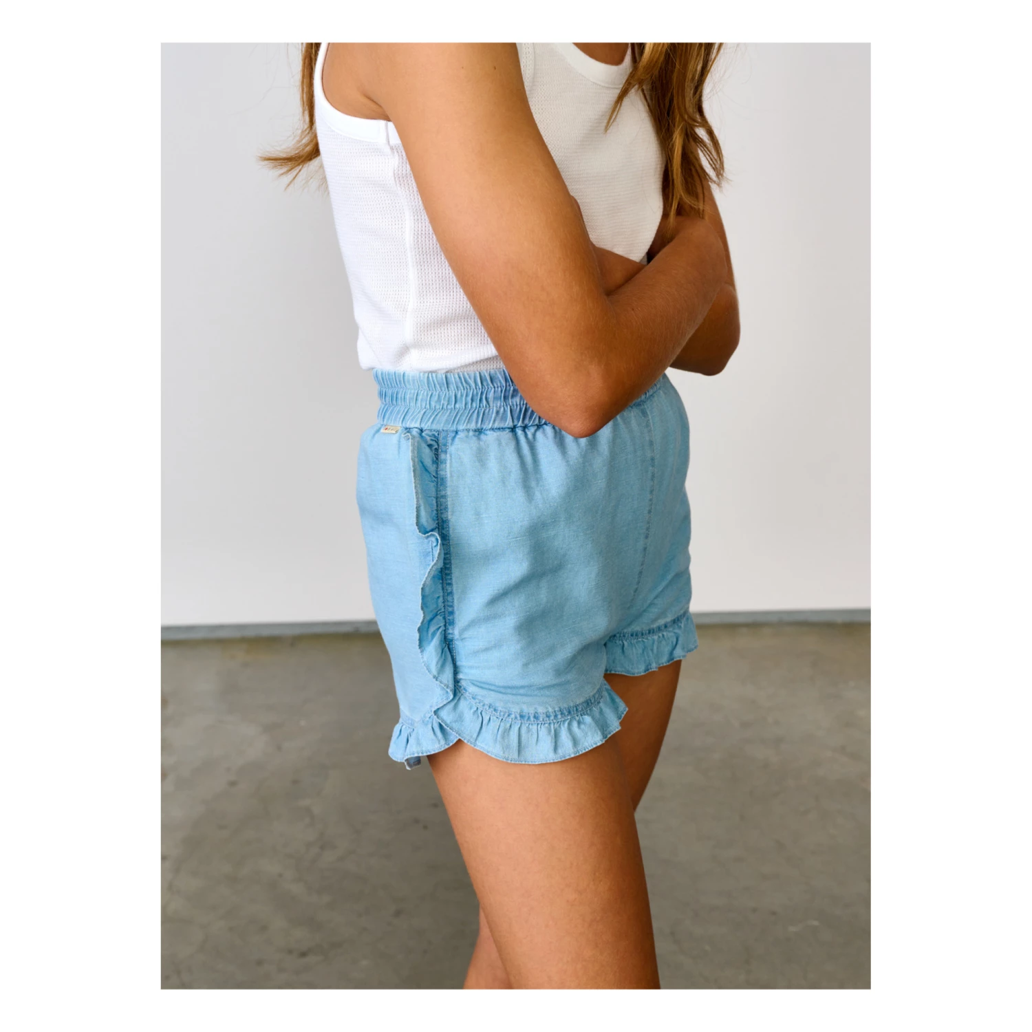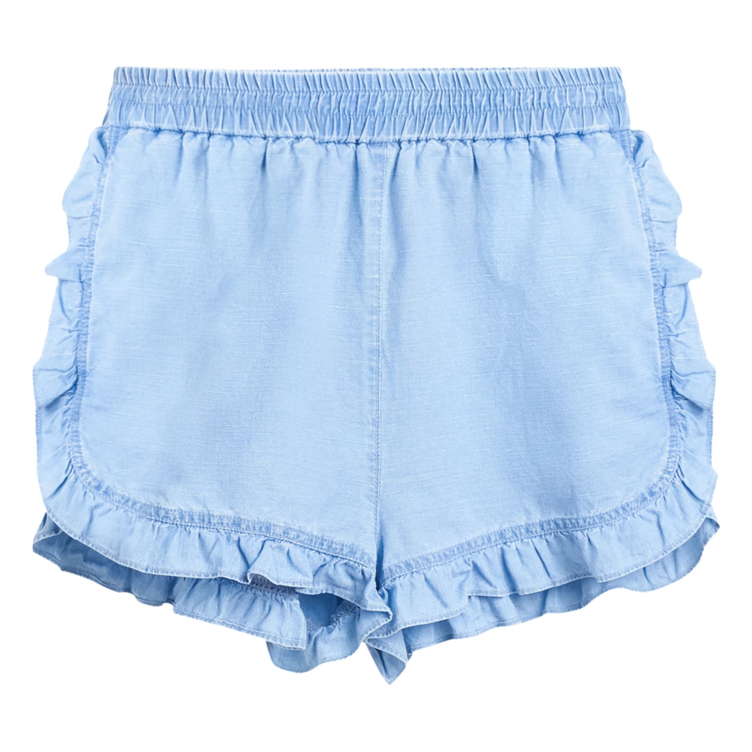- Rounded at the sides, Flowy, Lightweight and comfortable, Frilled edges, Contrasting top stitch, Elasticated waist, Sewn-in brand label