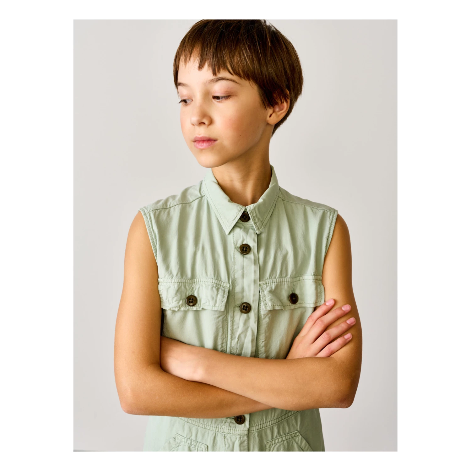 - Top stitched, Flap pocket(s), Decorative pocket(s), Front patch pocket(s), Back patch pocket(s), Sleeveless, Adjustable waist, Shirt collar