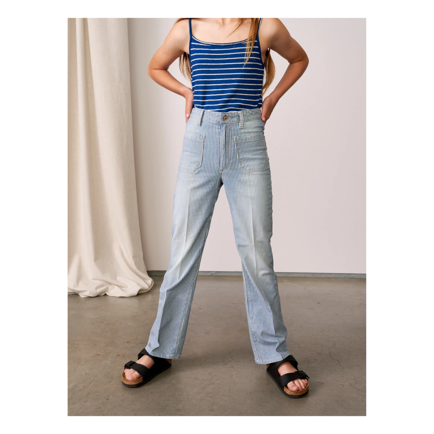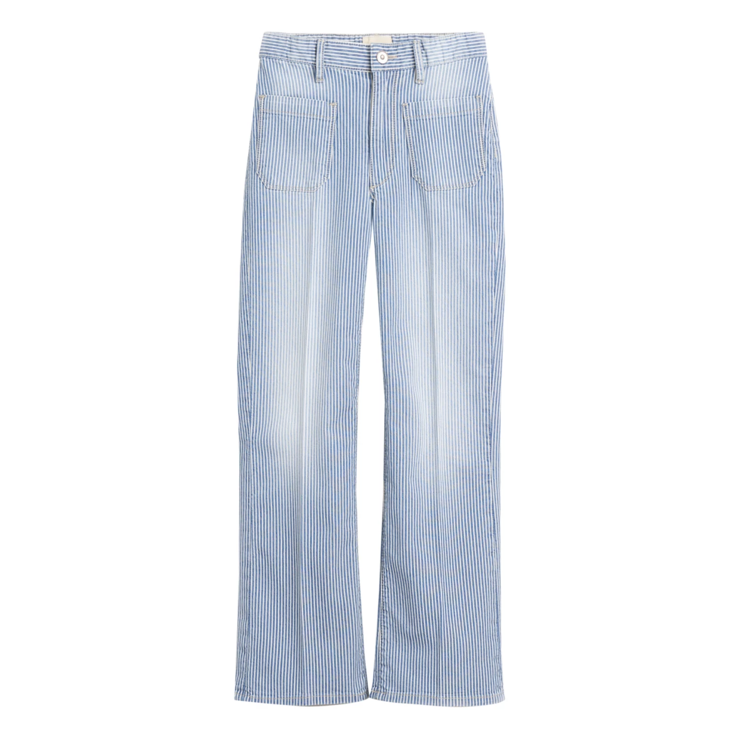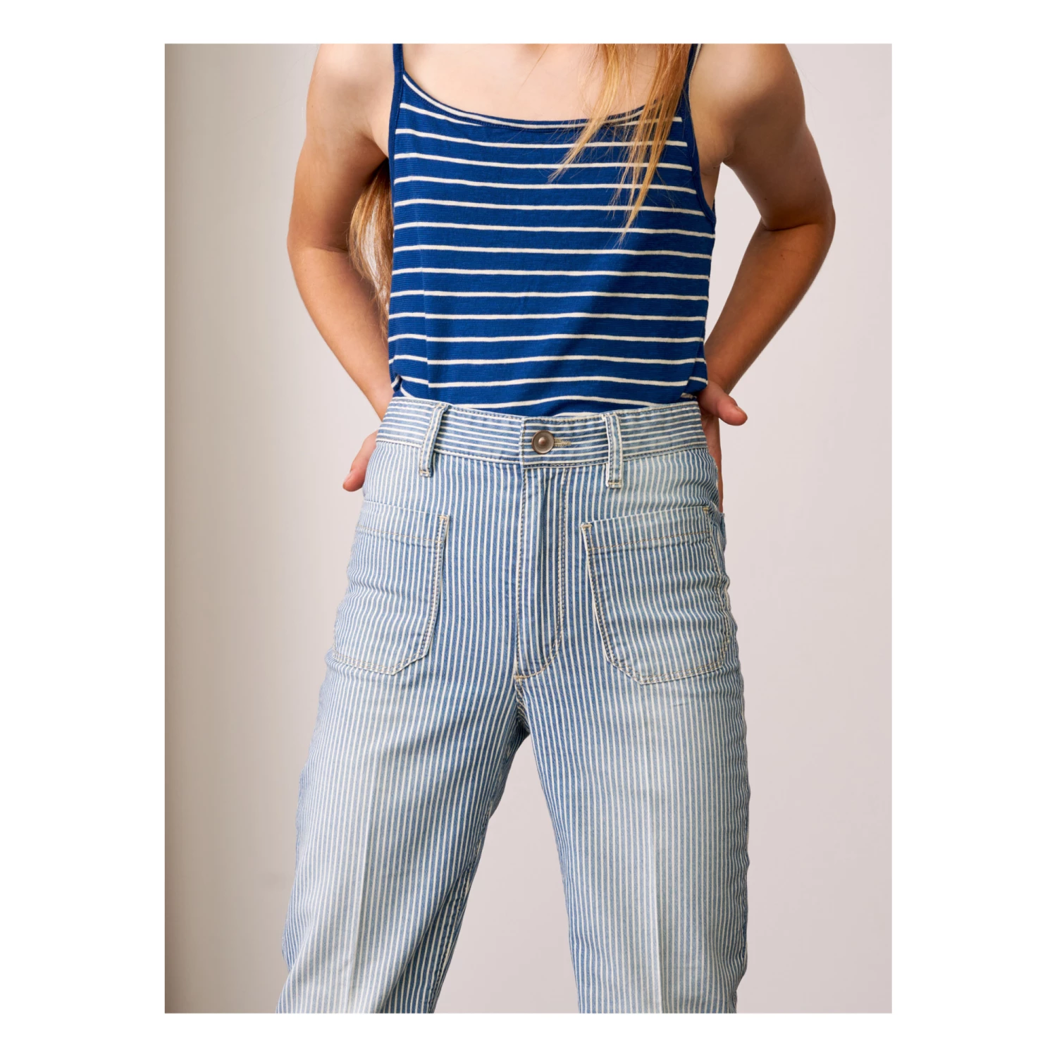 - Button(s) at the waist, Zip closure, Stripe print