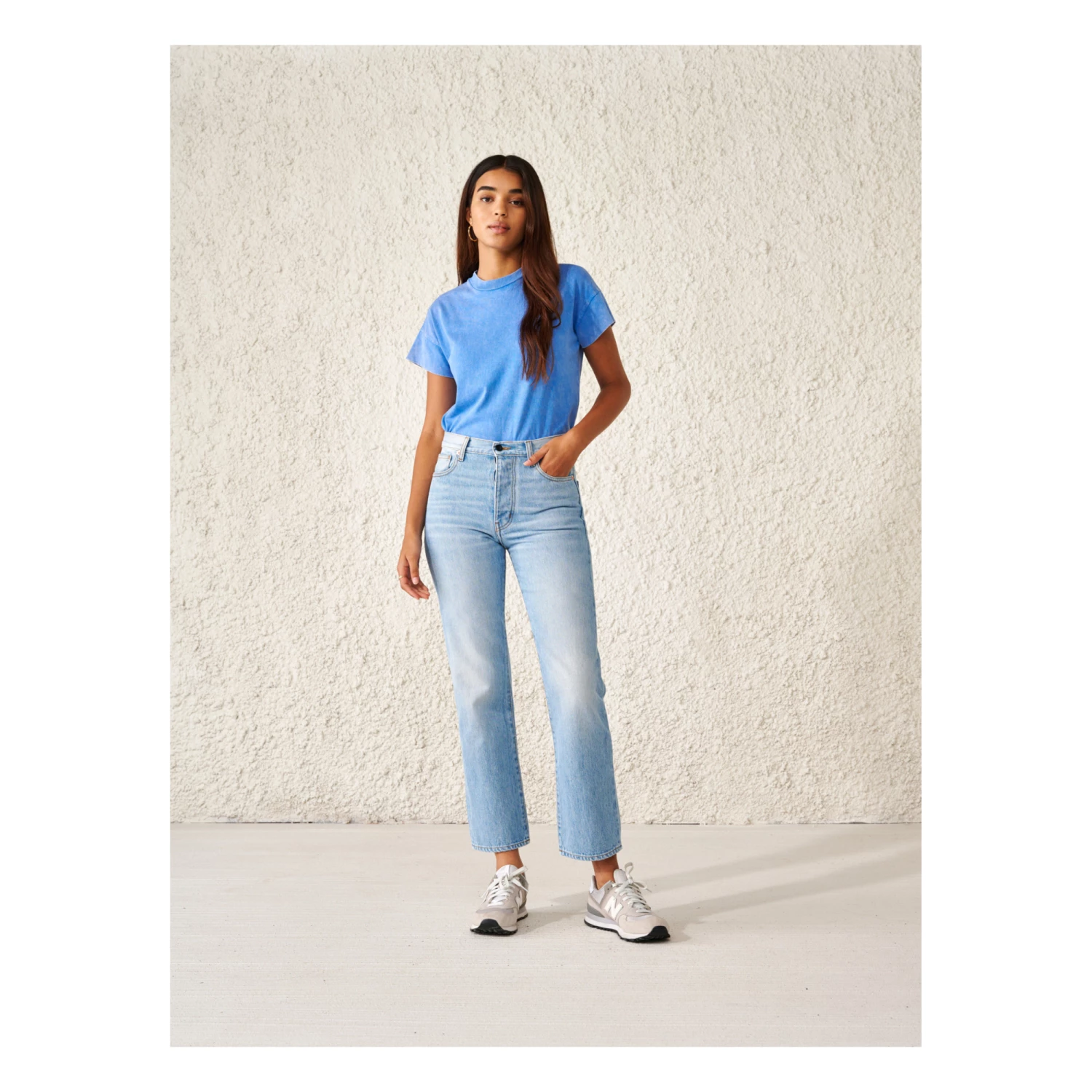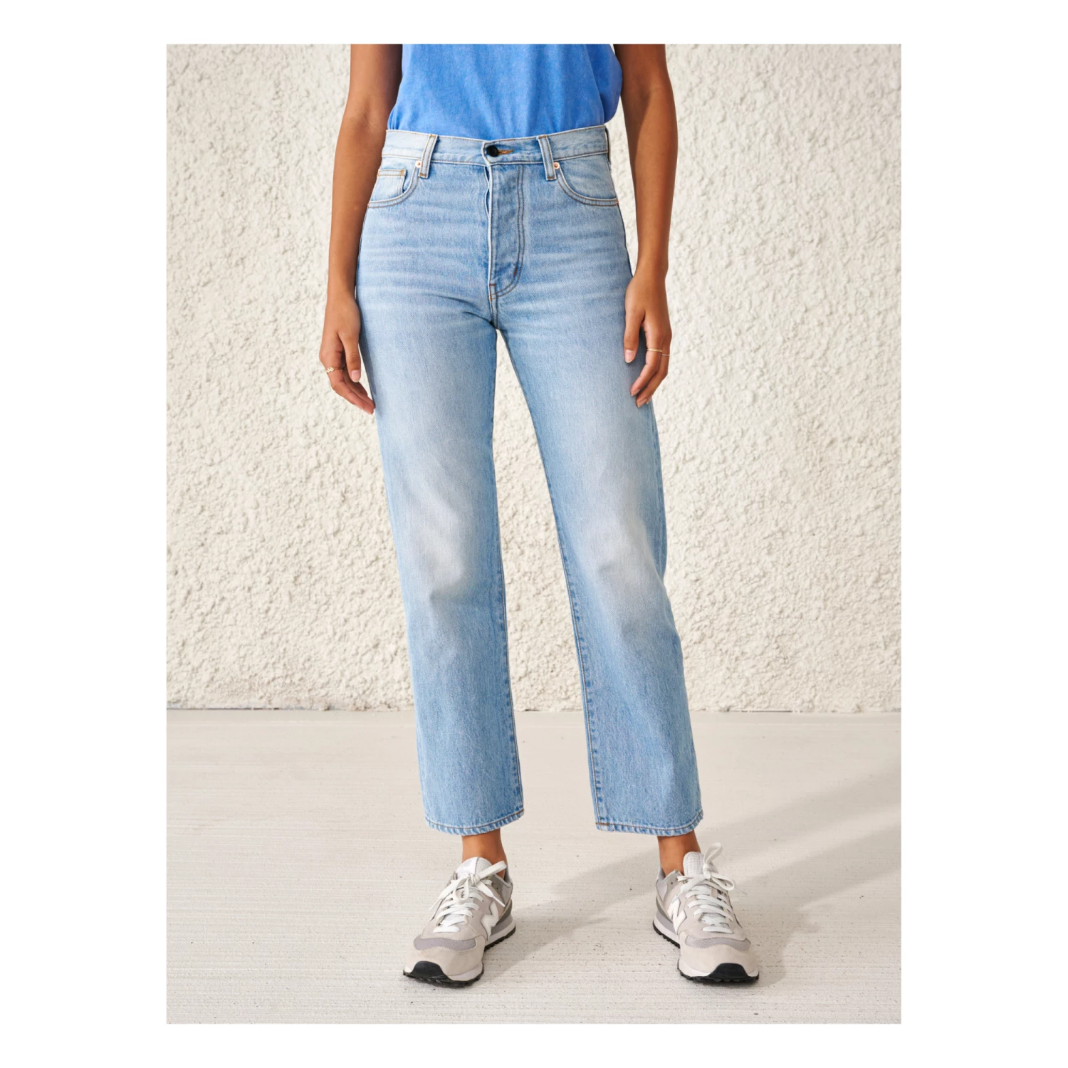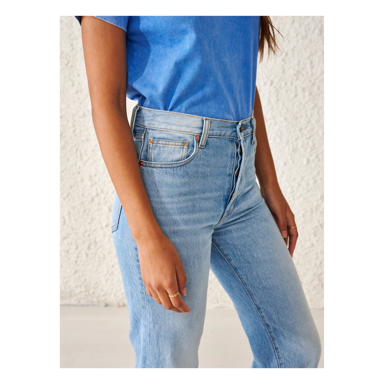- Stonewashed, Studs, 5 pockets, Contrasting top stitch, Belt loops at waist